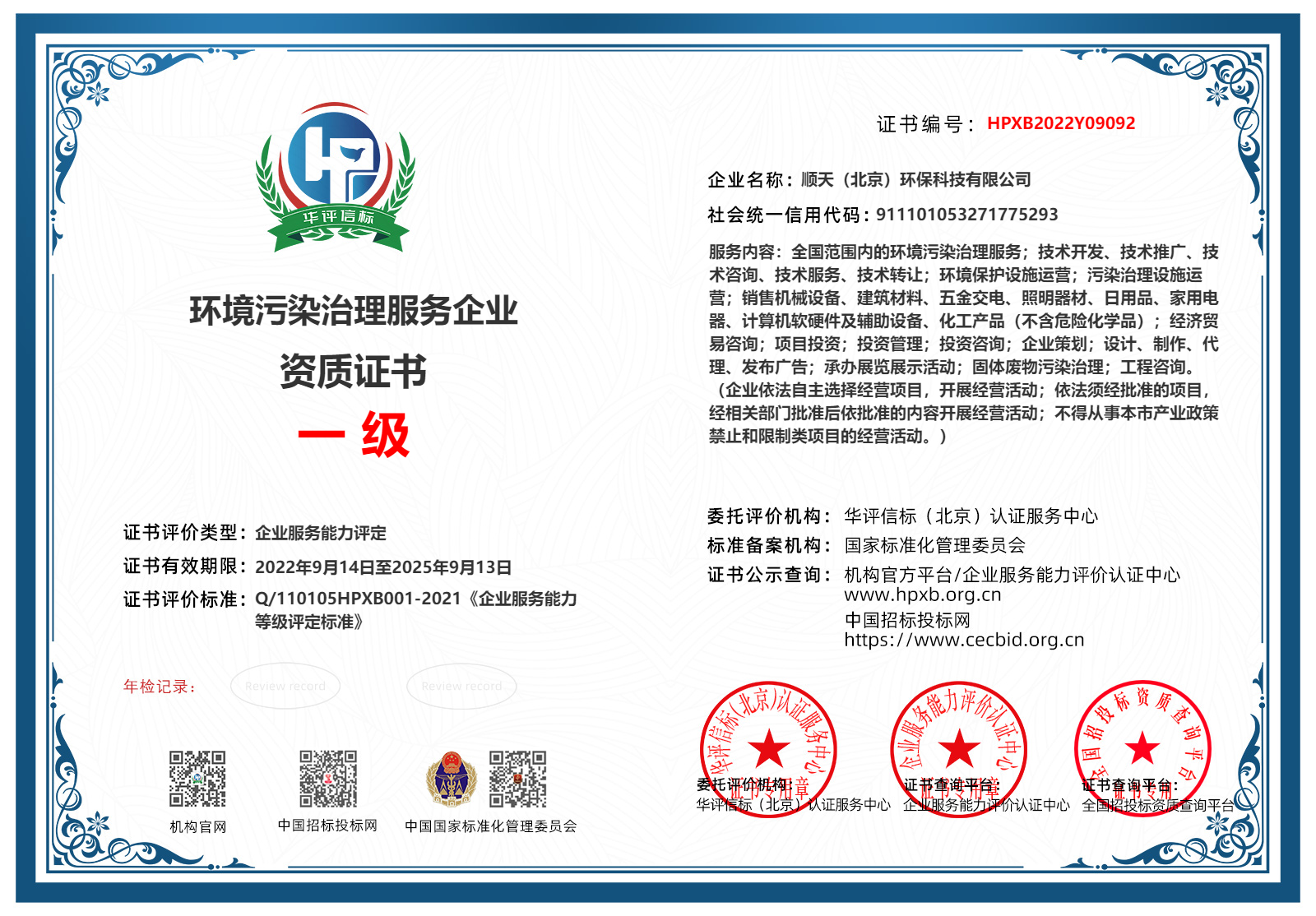 環(huán)境污染治理服務(wù)企業(yè)一級資質(zhì)證書