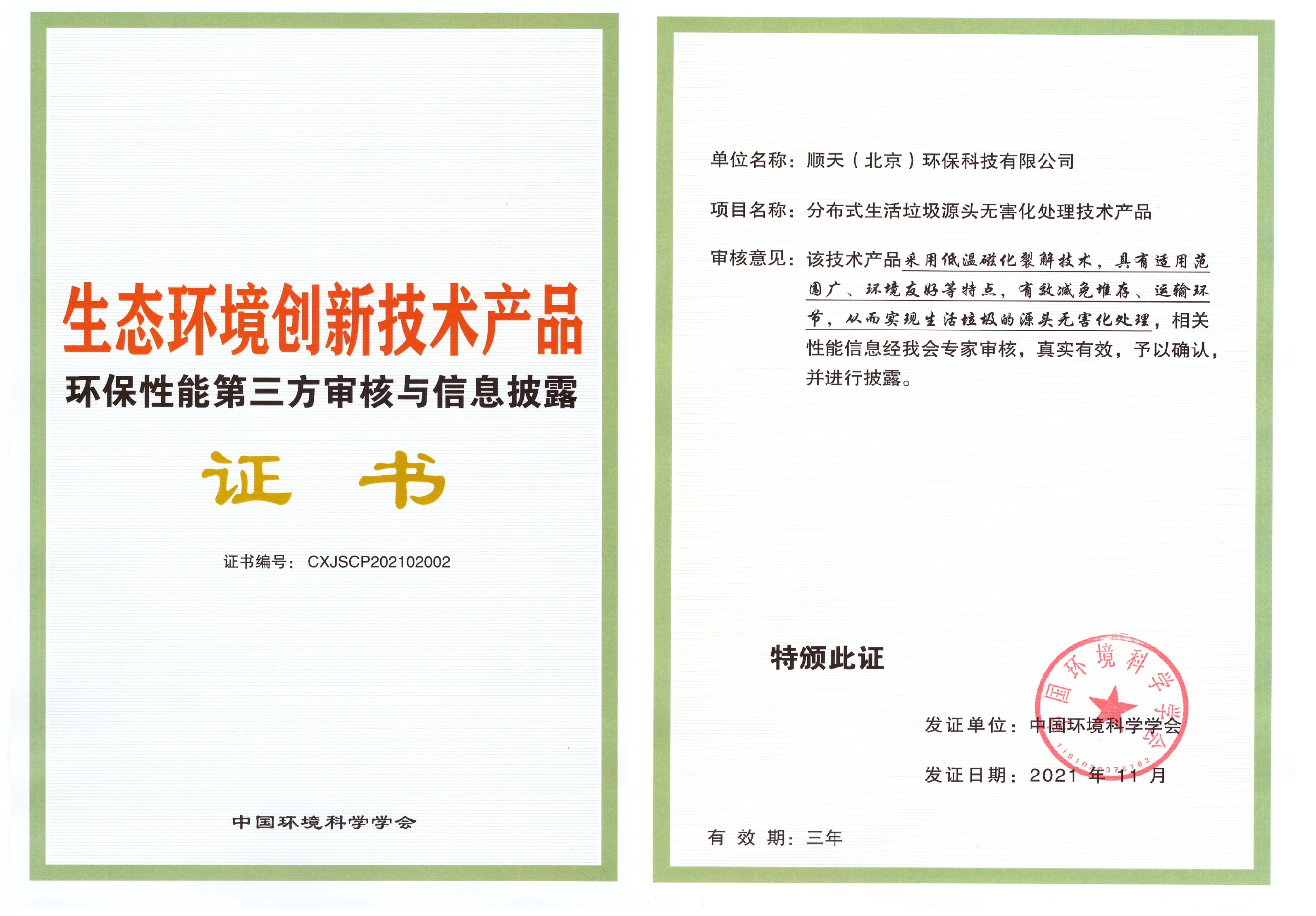 2021年被評為分布生活垃圾式源頭無害化處理生態(tài)環(huán)境創(chuàng)新技術(shù)產(chǎn)品。
