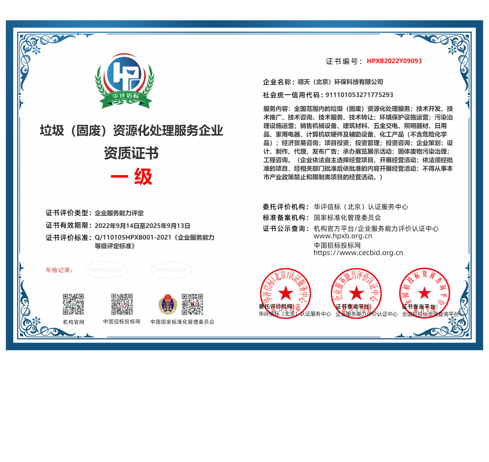 城鄉(xiāng)(固廢)資源化處理服務(wù)企業(yè)一級資質(zhì)證書