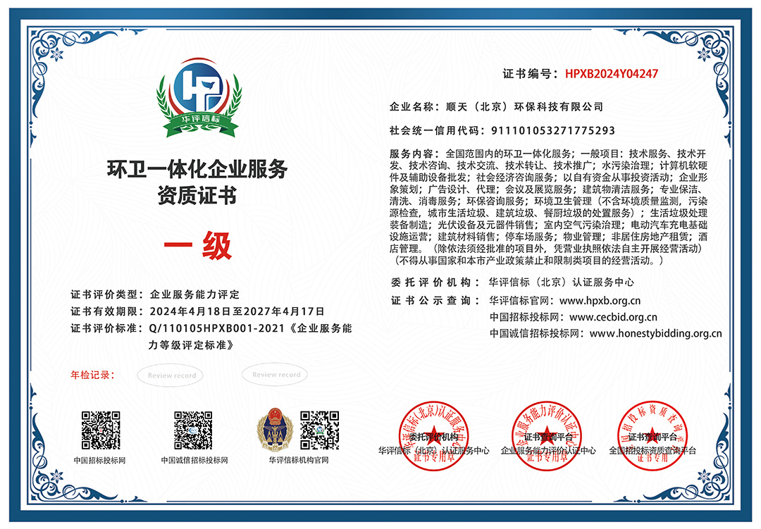 環(huán)衛(wèi)一體化企業(yè)服務(wù)一級資質(zhì)證書